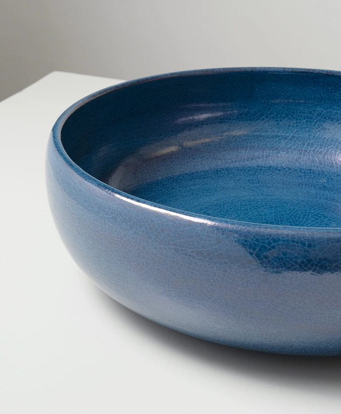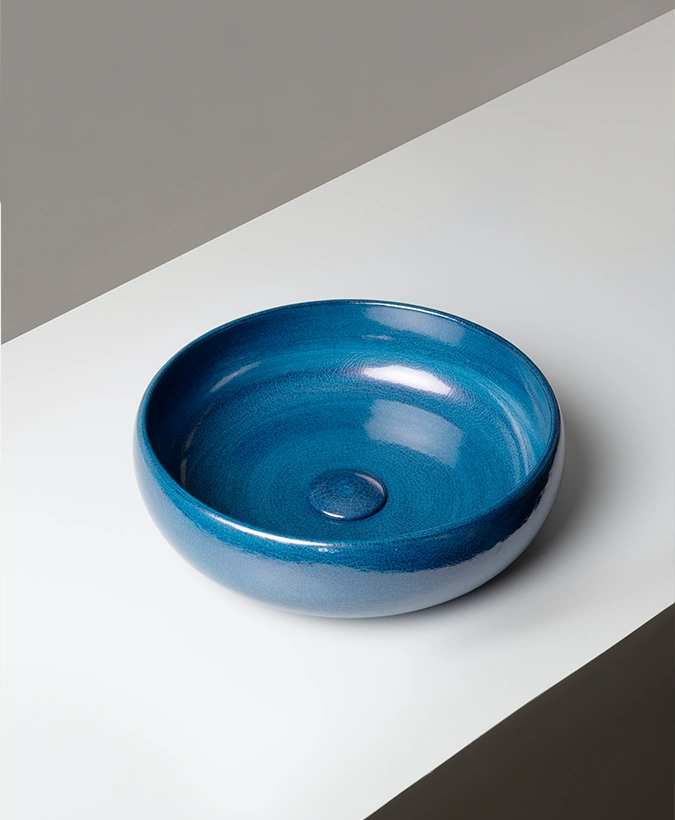 Hand-turned Raku clay countertop basin, enhanced with vibrant colored glazes. A primordial form with harmonious proportions, infused with energy and personality. The liveliest selection of the Ciocco model, perfect for dynamic spaces with a pop and contemporary character. Metallic lustre craquelé
