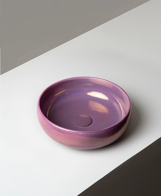 Hand-turned Raku clay countertop basin, enhanced with vibrant colored glazes. A primordial form with harmonious proportions, infused with energy and personality. The liveliest selection of the Ciocco model, perfect for dynamic spaces with a pop and contemporary character.