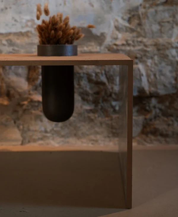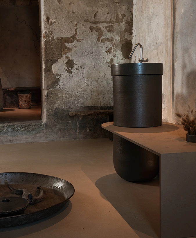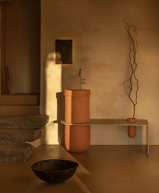 Un contenitore in ceramica più piccolo arricchisce le funzioni della composizione. Disponibile in tutte le finiture e terre, è pensata per adattarsi con eleganza a spazi outdoor e indoor, unendo versatilità, estetica e funzionalità.