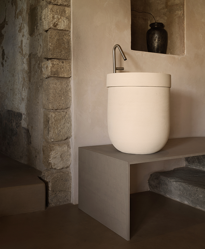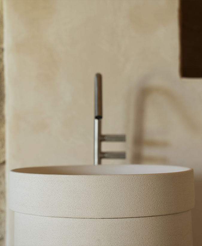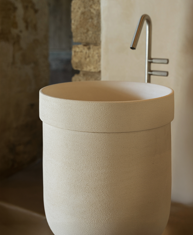 Disponibile in un’ampia gamma di finiture e terre, si adatta con naturalezza ad ambienti indoor e outdoor. La sua presenza verticale diventa elemento architettonico, capace di dialogare con lo spazio circostante e valorizzarlo. Progettato per installazioni con scarico a parete, accoglie rubinetterie a parete o in appoggio, offrendo libertà compositiva e un’estetica senza tempo.